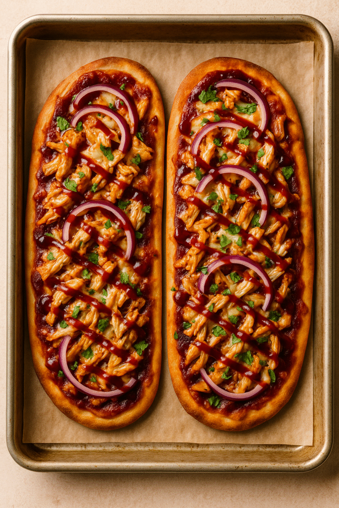 - Place flatbreads on a sheet pan and spread evenly with BBQ sauce.